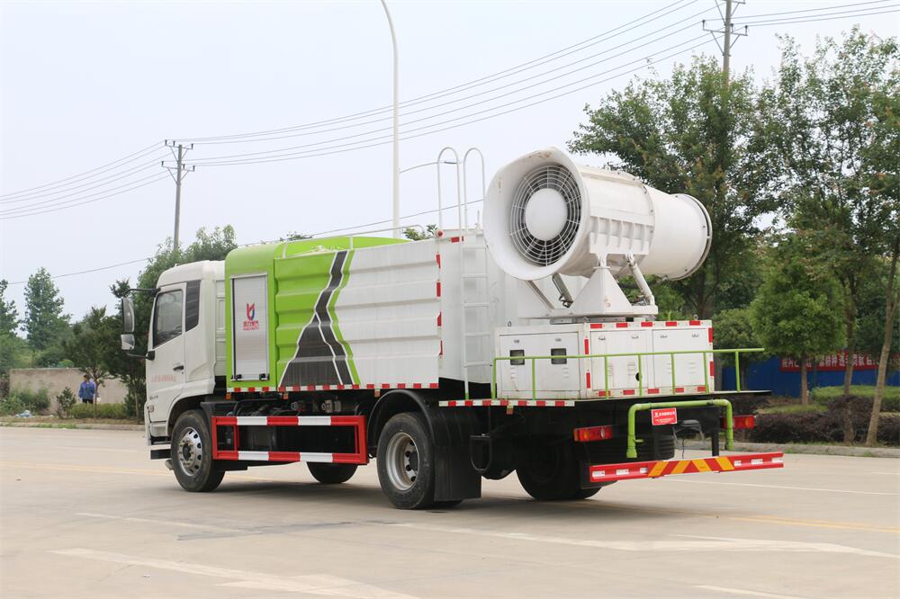 上裝配置:罐體容積為 12立方,選配風送式霧炮機組射程30米、40米、50米、60米、80米、100米、120米霧炮,罐體鋼板為4mm碳鋼Q235材質,罐內隔板具有防波作用,以減輕汽車行駛時罐體液體沖擊,罐體及整車外形尺寸按照公告。帶大功率專用灑水泵,泵可自吸自排,整車前沖、后灑、側噴、帶65消防接口,后平臺配CLW-50、CLW-60、CLW-80、CLW-100、CLW-120型風送式霧炮機組;罐體前封頭配大功率柴油發電機組;前封頭帶水位計,后平臺主管路帶1寸澆花接口,后爬梯。帶兩根輸水管及陰陽端。罐體顏色:銀/灰/綠,罐體兩側噴“多功能抑塵車”字樣,貼反光標示。